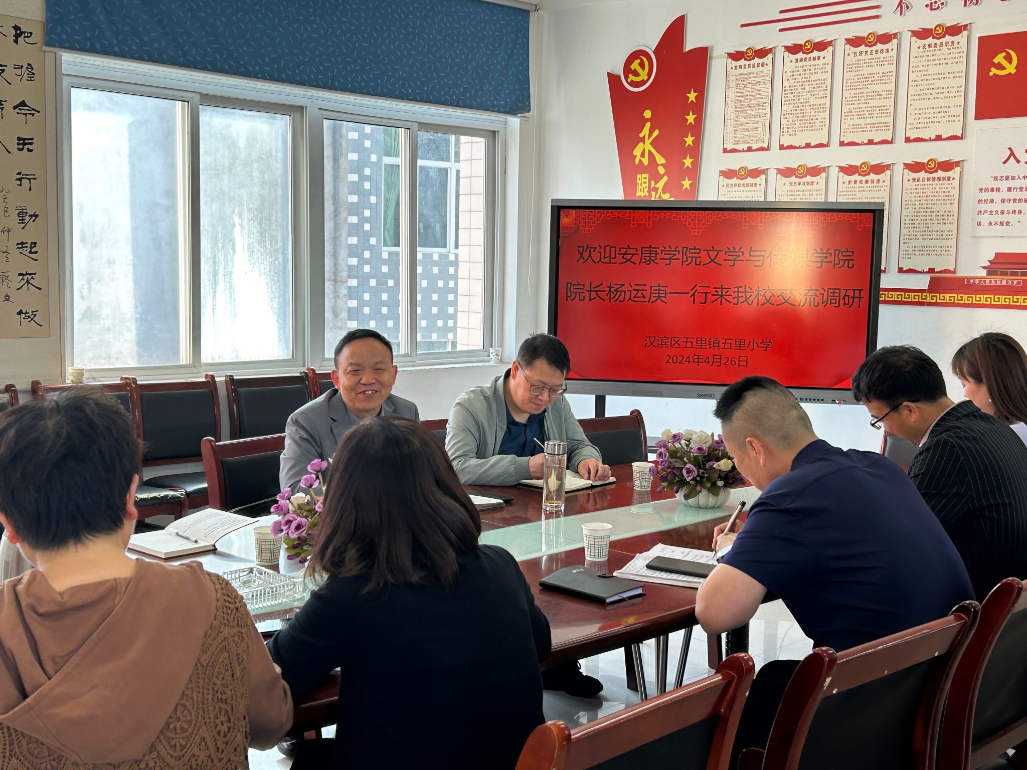 为进一步提升汉语言文学师范生人才培养质量,落实教育部“访企拓岗”促就业专项行动要求,4月26日,Beat365唯一官方网站院长杨运庚、教学副院长朱云和汉语言文学系主任谭诗民一行赴汉滨区五里小学征求用人单位和毕业生对Beat365官网汉语言文学专业人才培养的意见建议,并洽谈见习实习就业合作事宜。五里镇中心校校长、党总支书记张立安,五里镇中心校教研组长邓玉林,五里小学校长刘浩骋、党支部书记尹娟、副校长李宁、李巍,语文教研组长邓新萍及Beat365官网毕业生代表参加了调研会议。