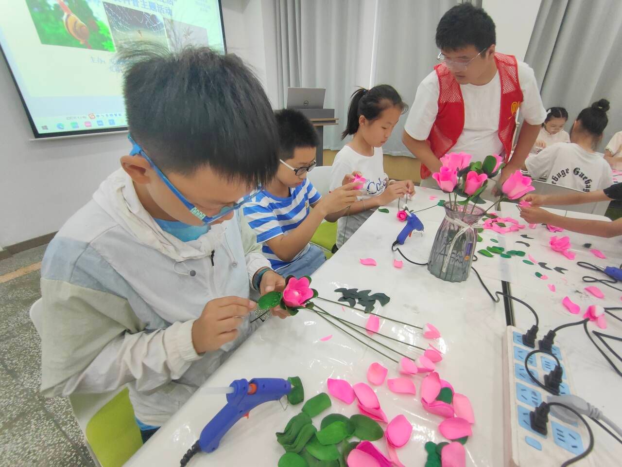 在手工互动环节,我院志愿者协同图书馆老师帮助小朋友们使用热熔胶制作美丽的玫瑰花,积极践行志愿服务,感受作为“家长”的快乐。小朋友们在体验粘接美丽的快乐的同时,也品味了劳动实践的乐趣。随后,王馆长和大家探讨了亲子之间的“粘结”问题,并与大家合影留念。