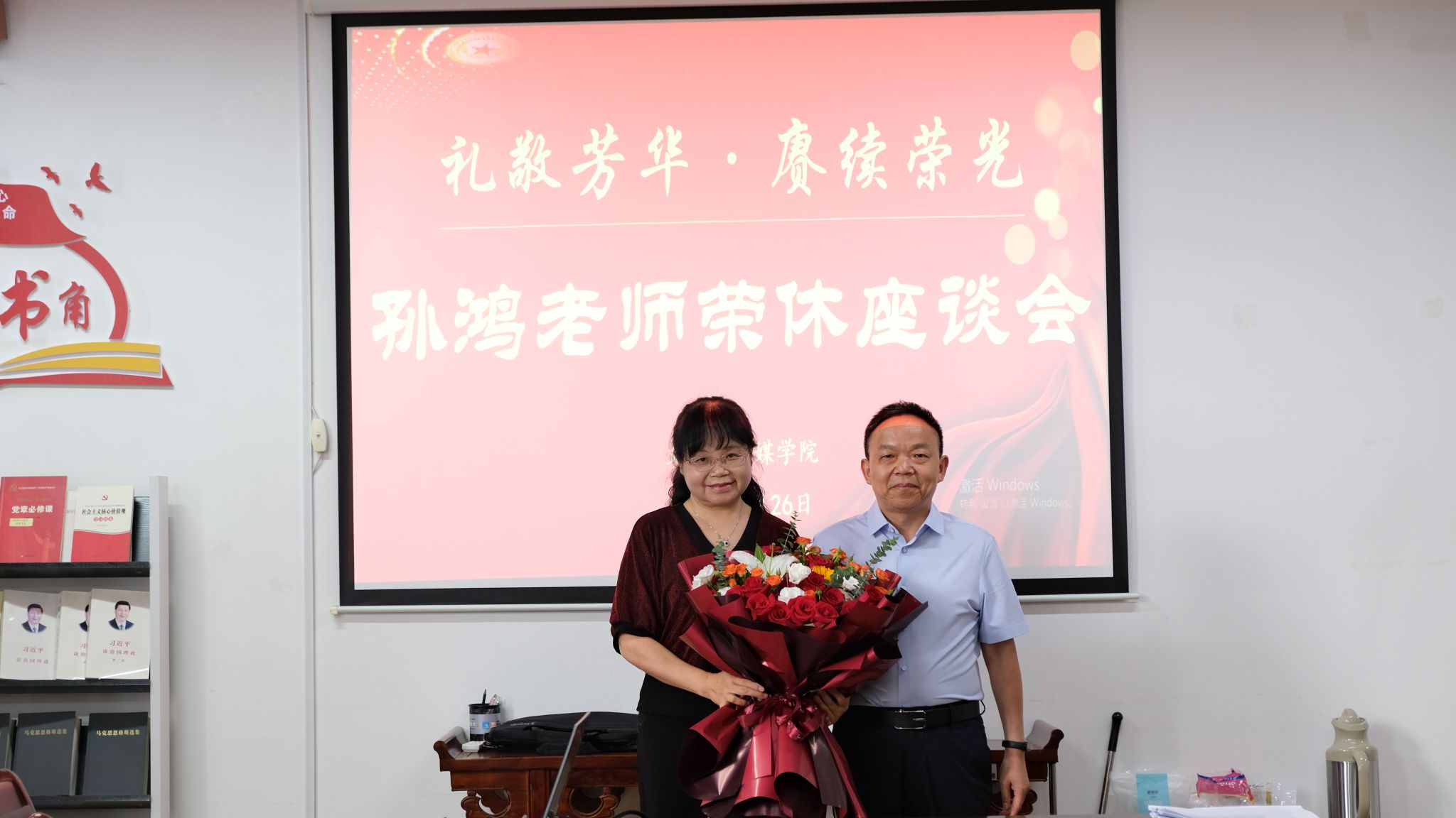 座谈会上,全体教师首先一起观看了“孙老师的荣休专属vlog”视频,回顾了孙教授从入校到退休的近40年人生经历和职业生涯中的精彩瞬间。院长杨运庚代表学院向孙教授献上鲜花,表达最崇高的敬意和最诚挚的感谢。