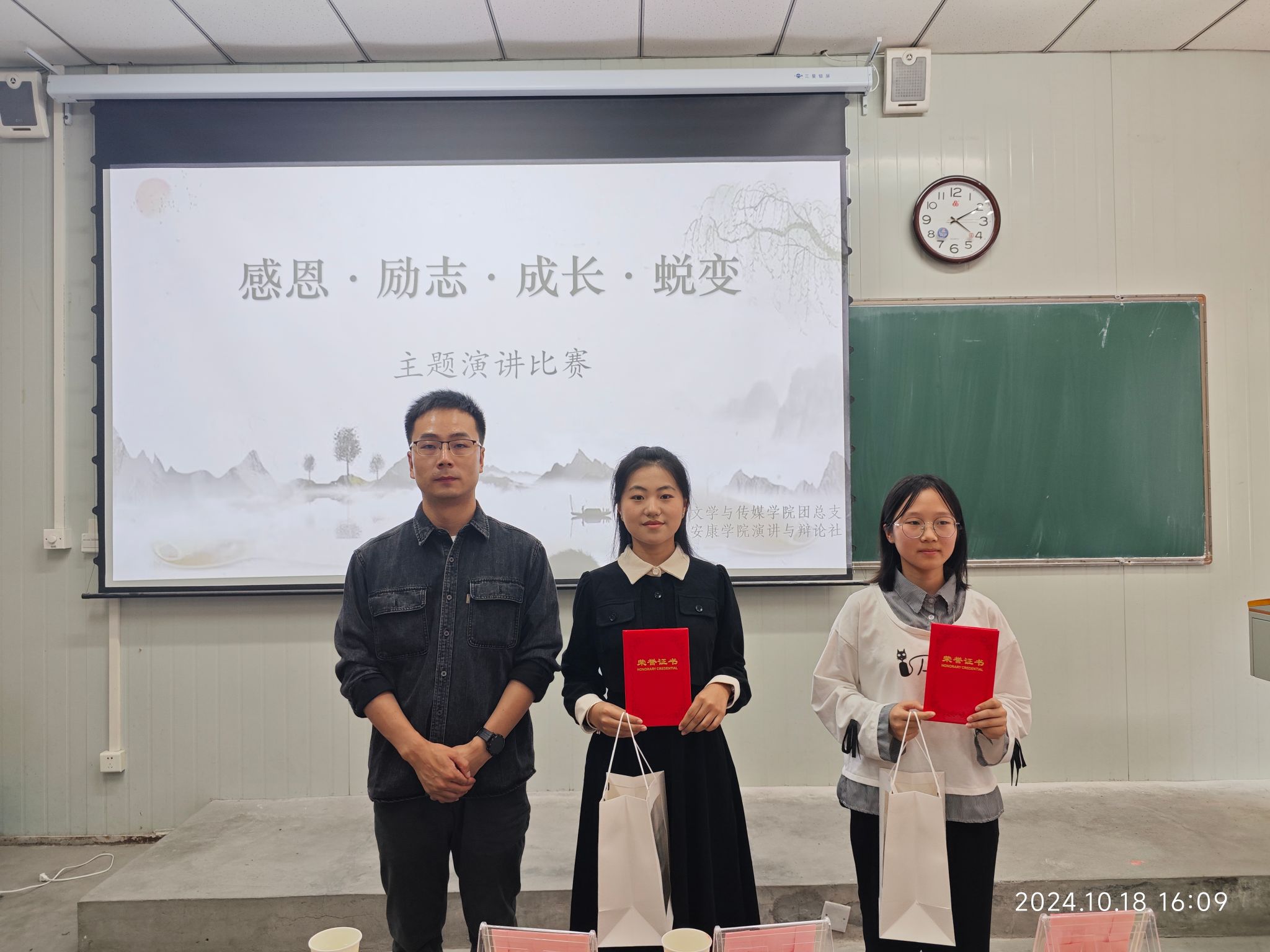 评委老师为获奖同学颁发荣誉证书,并合影留念。