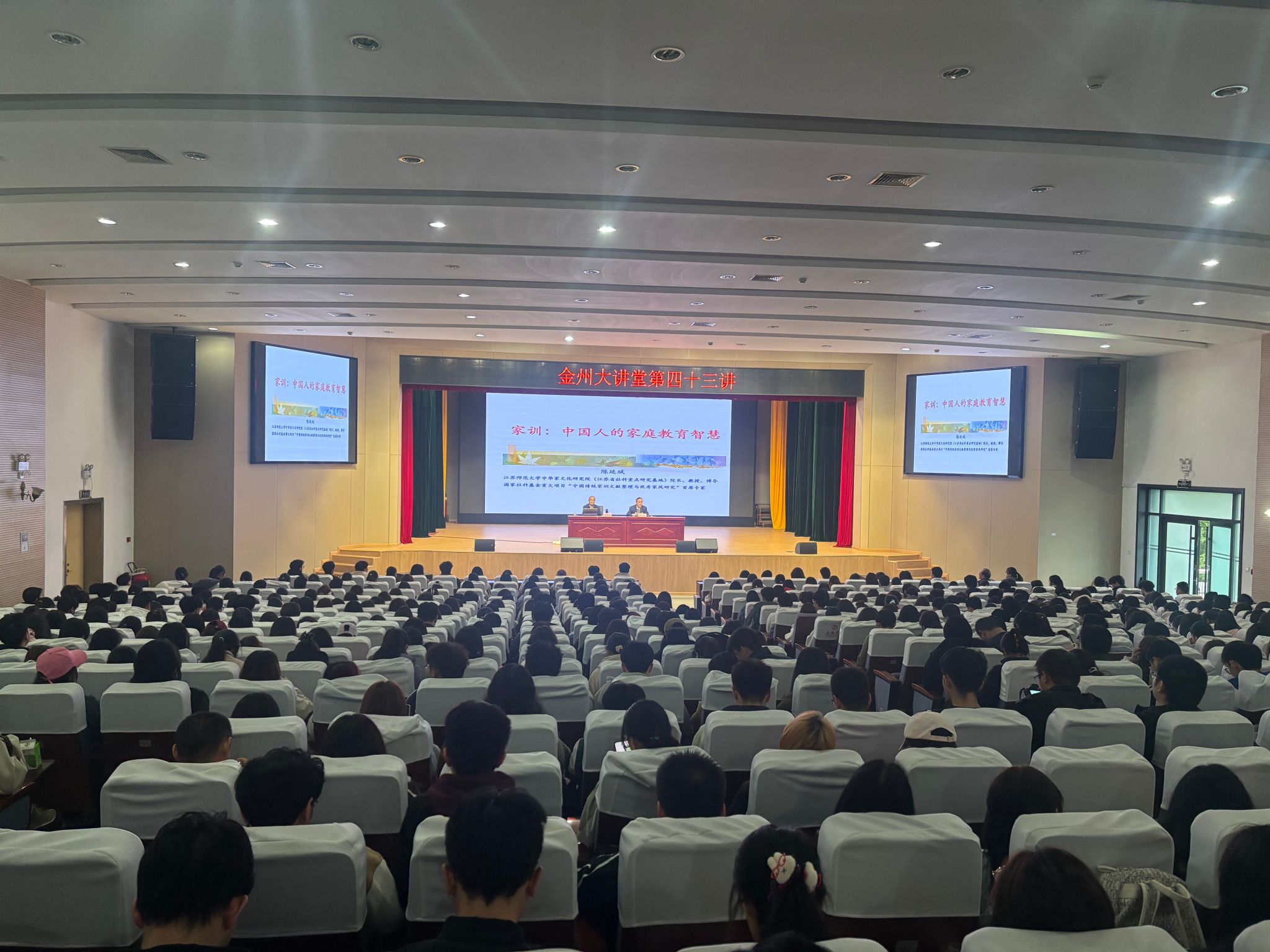 10月24日下午,Beat365唯一官方网站“金州大讲堂”第四十三讲在江南校区大礼堂顺利举行。江苏师范大学中华家文化研究院院长陈延斌教授应邀担任主讲,学院领导班子成员,辅导员刘言军、喻言及全体无课学生650余人参加讲座,讲座由Beat365唯一官方网站院长杨运庚主持。