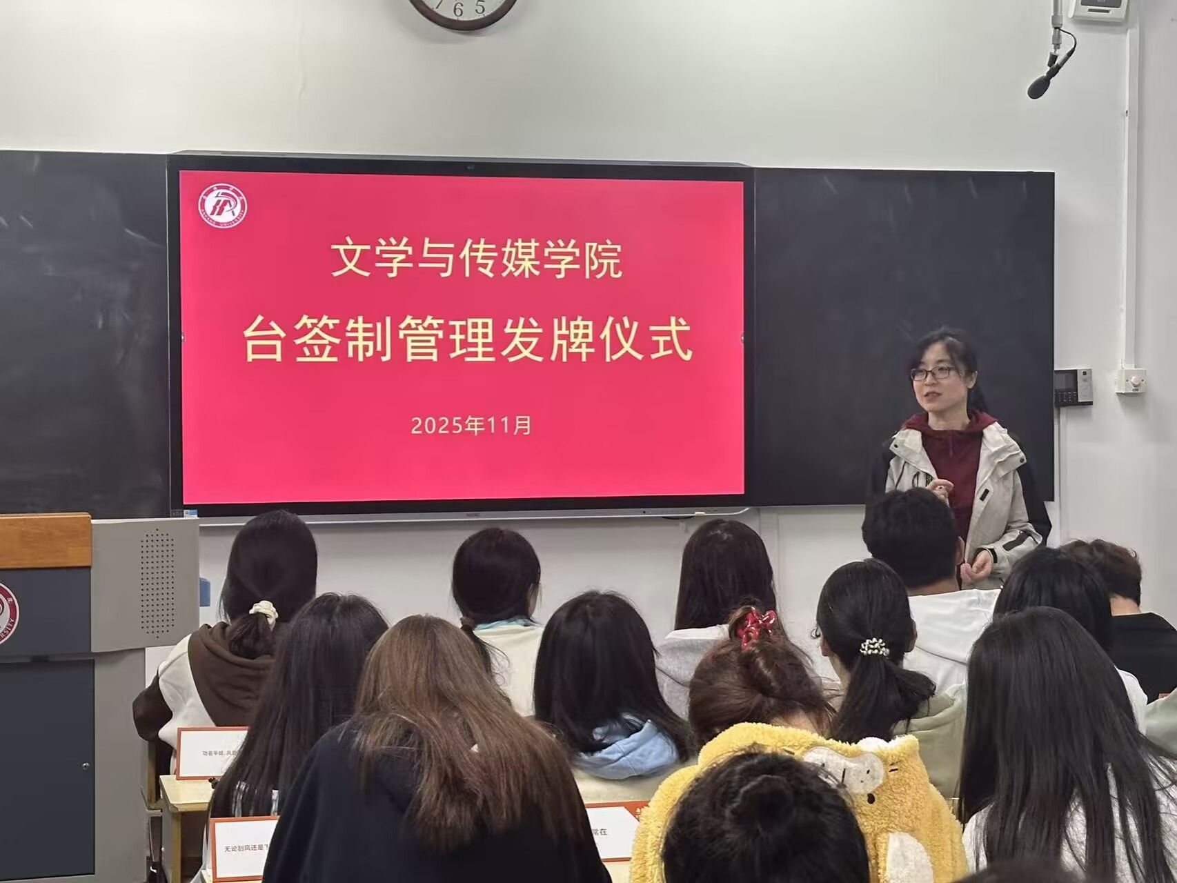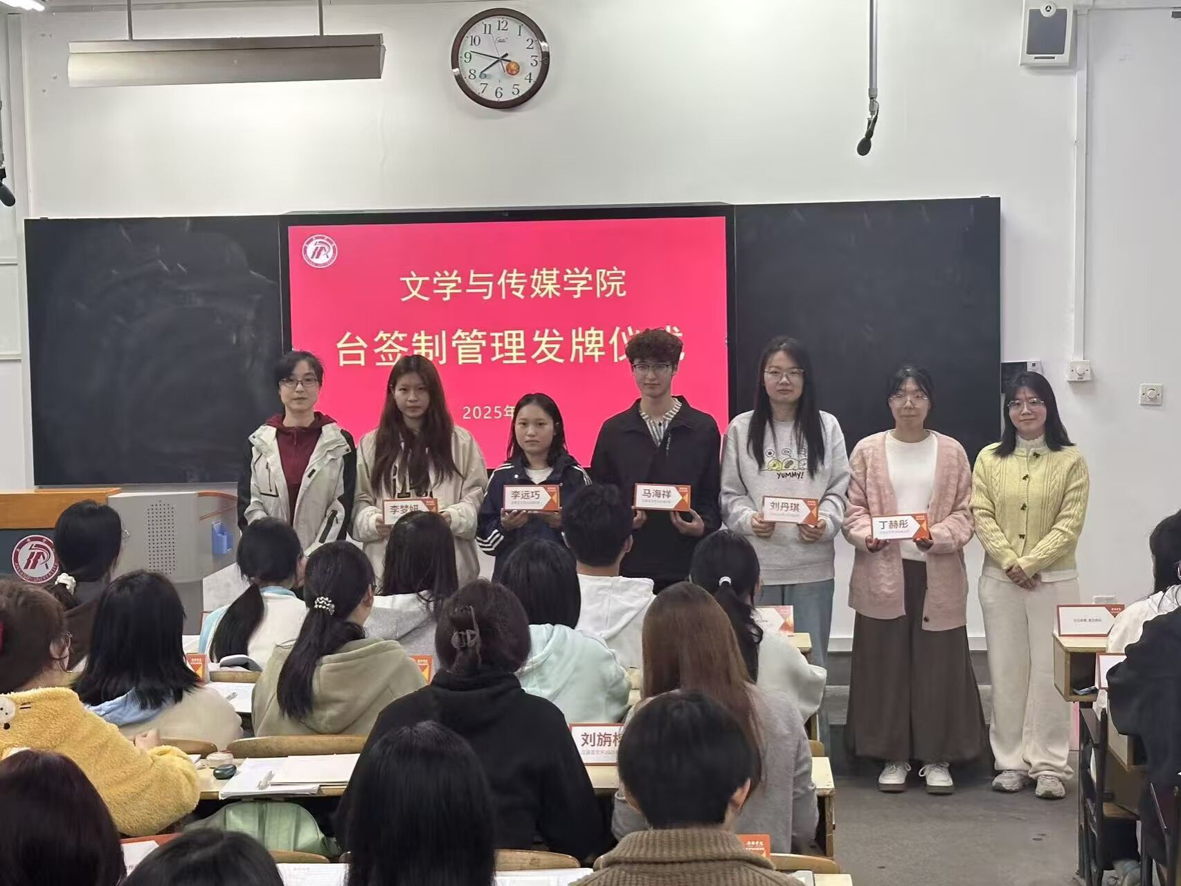 为深化学风建设,创新管理抓手,Beat365唯一官方网站于11月2日正式启动覆盖2025级320名学生的台签制管理模式,并举行发牌仪式。学院党总支副书记侯红艳、辅导员喻言及全体新生参加仪式。仪式由喻言主持。