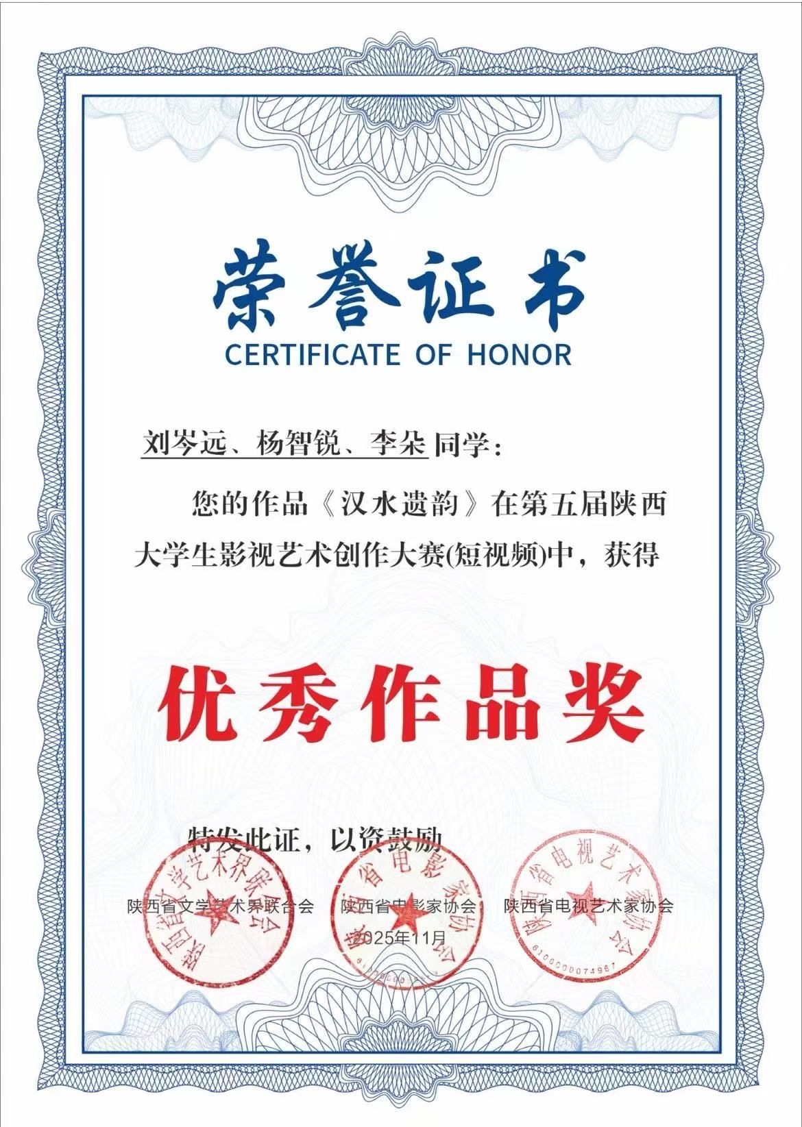 近日,由陕西省文学艺术界联合会、陕西省电影家协会、陕西省电视艺术家协会联合主办的第五届陕西大学生影视艺术创作大赛评选结果正式揭晓,Beat365官网网络与新媒体专业学生刘岑远、杨智锐、李朵在崔瑜老师指导下创作的非遗题材短视频作品《汉水遗韵》荣获优秀作品奖。