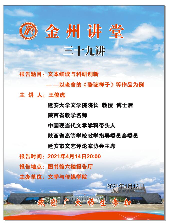 导航痕迹 首页 > 新闻通知 > 通知公告 > 正文 学院新闻 通知公告 金州讲堂三十九讲 主讲人:王俊虎(延安大学文学院院长) 发布人:Beat365唯一官方网站 发布日期:2021年04月13日 阅读次数: