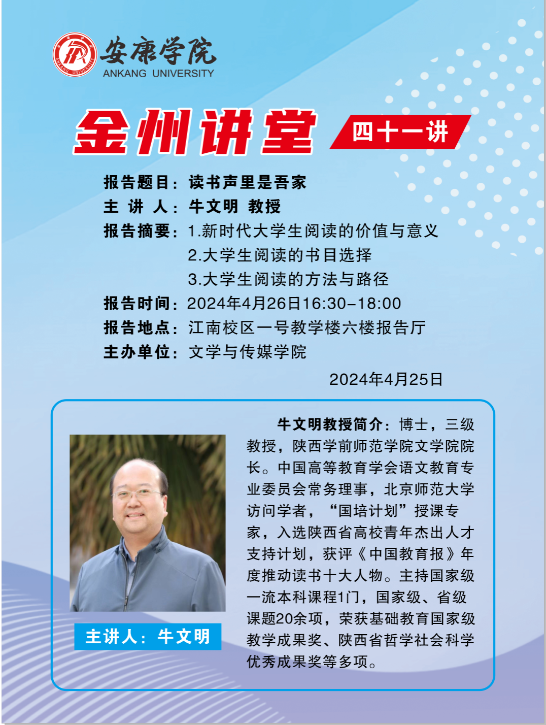 导航痕迹 首页 > 新闻通知 > 通知公告 > 正文 学院新闻 通知公告 金州讲堂四十一讲 主讲人:牛文明(陕西学前师范学院文学院院长) 发布人:Beat365唯一官方网站 发布日期:2024年04月24日 阅读次数: