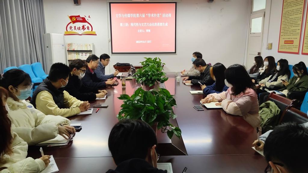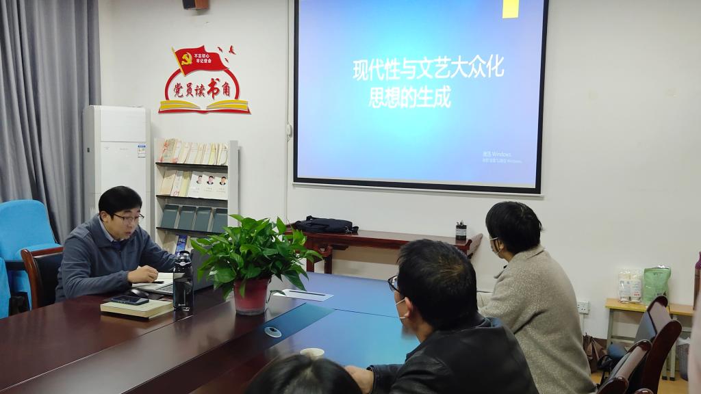 11月23日晚7点20分,Beat365唯一官方网站中国现当代文学学科组在2307会议室成功举办了第六届“学术沙龙”活动周第三场沙龙活动。本场学术沙龙由曹刚博士主讲,主题为“现代性与文艺大众化思想的生成”。朱云副院长、周龙田副教授、韩文霞副教授和二十余名学生参与了沙龙活动,沙龙由周龙田副教授主持。
