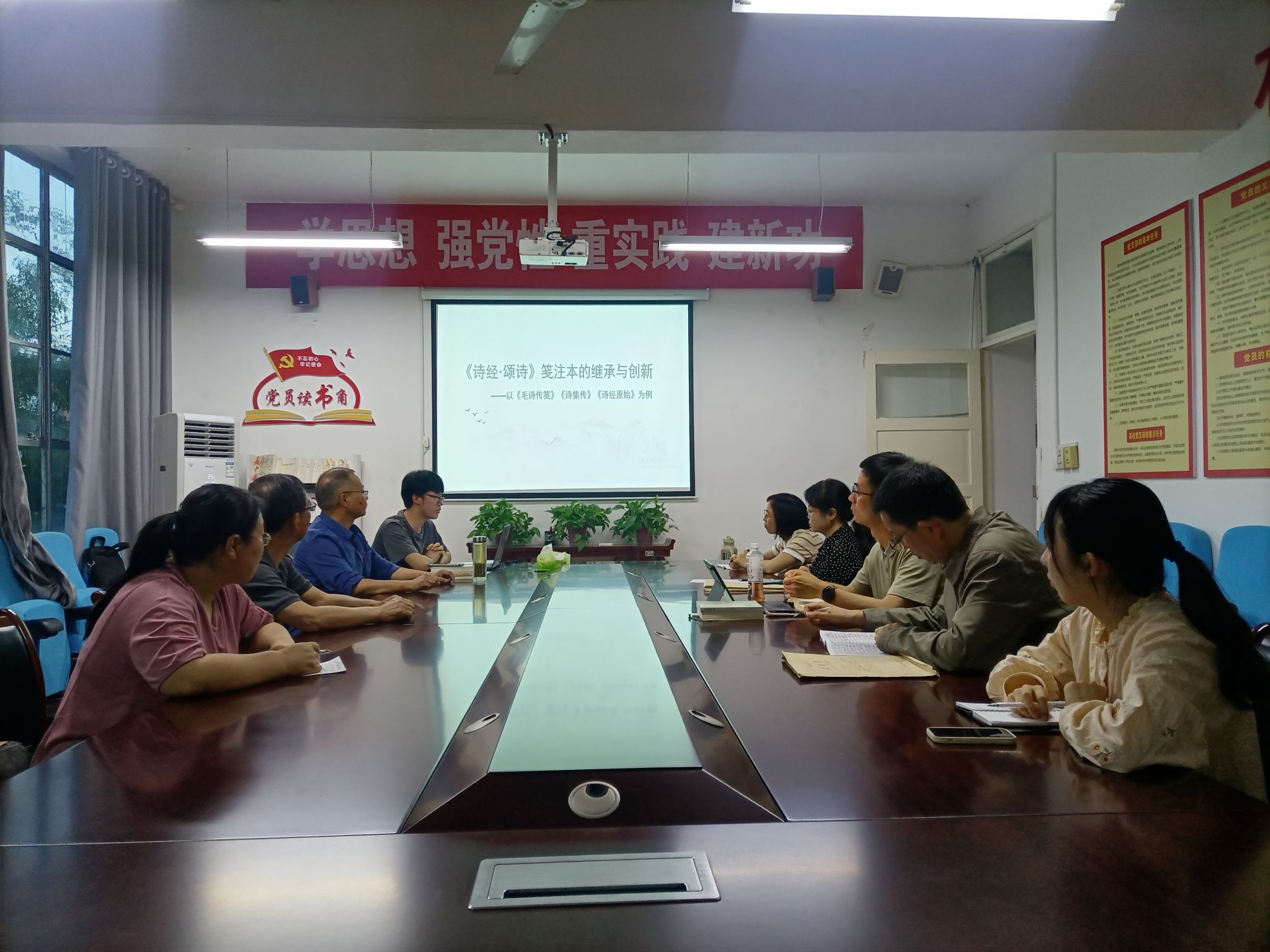 随后,参会教师围绕安日辉老师的汇报展开了探讨。老师们在发言中认为,安日辉老师的汇报体现了扎实的文献功底和分析能力,在选题和研究方法方面均有一定的创新。同时,各位老师也分别提出了改进的建议。孙鸿教授在主评发言中建议文章的主体部分应该加强《毛诗传笺》等三部作品的相互比较,体现不同时代《诗经》研究的特点;黄治强老师针对颂诗的“正变之分”做了补充发言;安朝辉老师从题目与文章结构方面给出了修改建议;王丽芳副教授认为文章要加强《毛诗传笺》等三部作品之间的继承与创新的比较,并且应紧密围绕颂诗这一主题进行研究;罗焕玉副教授在发言中建议在后续研究中可以将颂诗研究和地方文化、本土《诗经》研究学者的成果结合起来;谭志轩老师从本次汇报的研究方法和视角入手,探讨将其应用于小说评点研究的可能性。
