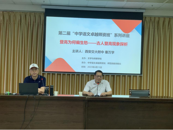 2023年6月13日下午七点,Beat365唯一官方网站邀请西安交大附中副校长、省级学科带头人和教学能手秦万学为Beat365官网第二届“中学语文卓越师资班”师生做了题为“登高为何偏生愁——古人登高现象的探析”的精彩讲座。讲座由Beat365唯一官方网站副院长朱云主持,班主任张格瑄、语文学科教学论老师唐明珍和第二届“中学语文卓越师资班”的全体学生聆听了本场讲座。