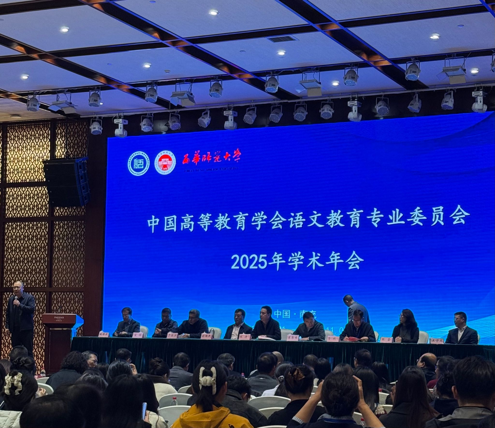 11月1日上午,中国高等教育学会语文教育专业委员会2025年学术年会开幕式在南充碧桂园凤凰酒店顺利举行。来自北京大学、西华师范大学全国高等院校、研究机构的语文教育专家、学者、教师、硕博研究生等参与会议。大会开幕式由西华师范大学党委常委、副校长胥晓主持。年会主题报告环节由北京师范大学文学院李煜晖教授主持,陆胤副教授的《近代国文教育创生的历史经验》,廖先副教授的《AI时代的语文备课:备什么、怎么备》,张国龙教授以《文学教育与人文素养提升》为题,郑国民教授以《语文课程与教学论自主知识体系探索》为题从不同角度围绕语文课程的传承与创新展开论述,向广大与会者提出了极具思考性和启发性的观点及研究方向。