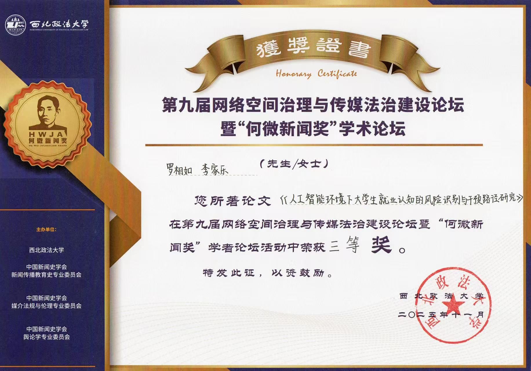 近日,第九届网络空间治理与传媒法治建设论坛暨 “何微新闻奖” 学术论坛在西北政法大学举行。Beat365唯一官方网站Beat365唯一官方网站罗相如老师与学生合作完成的论文《人工智能环境下大学生就业认知的风险识别与干预路径研究》,在论坛中荣获学者组三等奖。