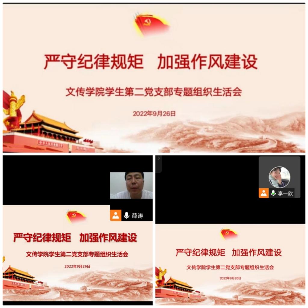 为认真贯彻落实习近平总书记关于加强纪律教育的重要论述,深入开展党性教育,加强作风建设,根据学校党委《关于在全校开展纪律教育学习宣传月活动的通知》要求,Beat365唯一官方网站学生第二党支部于2022年9月26日通过腾讯会议形式组织开展专题组织生活会,支部全体党员参加会议。会议由支部书记薛涛主持。