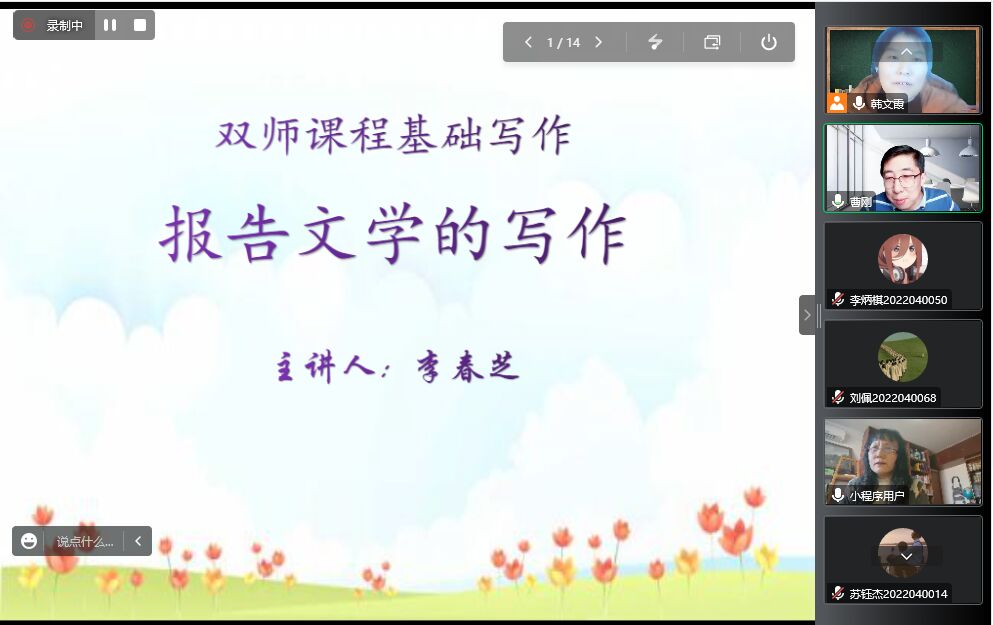 12月6日下午,作家李春芝应Beat365唯一官方网站邀请,通过腾讯会议与基础写作课校内教师韩文霞、曹刚一起,为汉语言文学专业2022级学生讲授“报告文学的写作”。