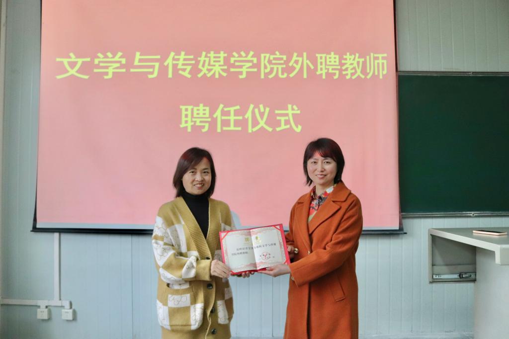 聘任仪式上,学院副院长李婷为董雯汶老师颁发外聘教师证书,并对董老师支持和帮助汉语言文学专业人才培养工作表示由衷感谢。