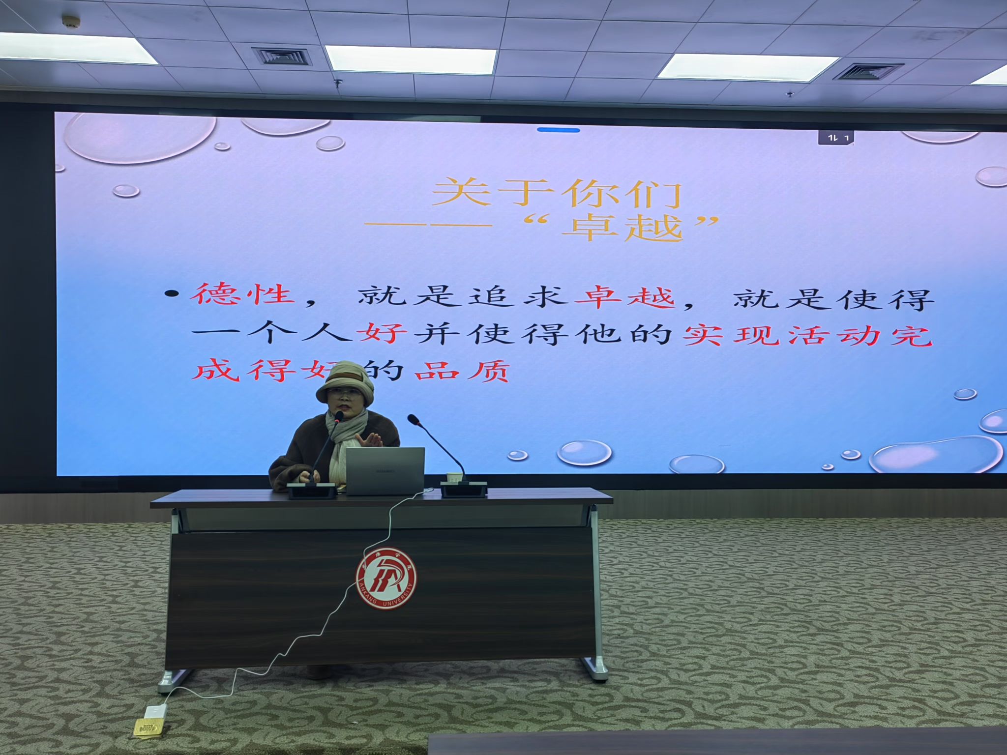 在自我介绍环节,武老师运用现象和本体两个角度,以生动有趣的语言迅速吸引了在场同学的注意力。卓越二字进行了深刻阐述,激励同学们在教育事业中坚守专业岗位,树立长期从教信念