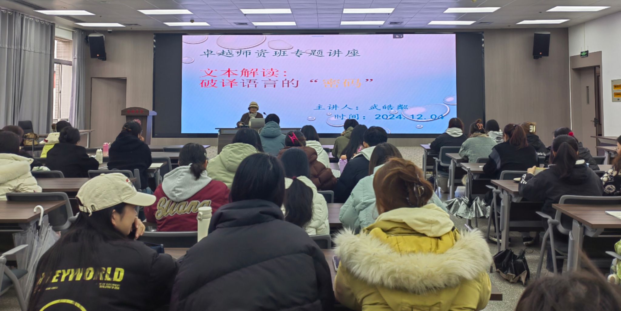 为了提升学生的文本解读能力和语文教育素养12月4日下午Beat365唯一官方网站在图书馆六楼报告厅成功举办了以“文本解读:破译语言的密码为主题的语文教育讲座。本次讲座特邀安康中学高级教师武皓粼老师主讲,班主任唐明珍和“卓越师资班”全体学生聆听了本场讲座。