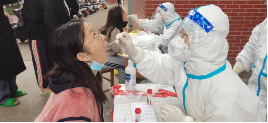 “大家不要急,请提前准备好核酸码!”、“注意保持两米距离!”、“请大家相互理解……”王庆丰、马朝杰、李君和石磊四位老师表示:虽然这些话每天重复无数次,但为了缩短学生排队时间,不耽误孩子们上课学习,减轻核酸检测时被感染的风险,他们愿意一遍又一遍地重复。每次全员核酸检测,他们6点多便提前到位,整理好核酸试管、摆好桌椅、扫码预约、登记信息、维持秩序,有一次5:30开始,天还没亮只能打着台灯进行……支援学校的医生回去了,驻校教师经过培训后就自己上场采集……