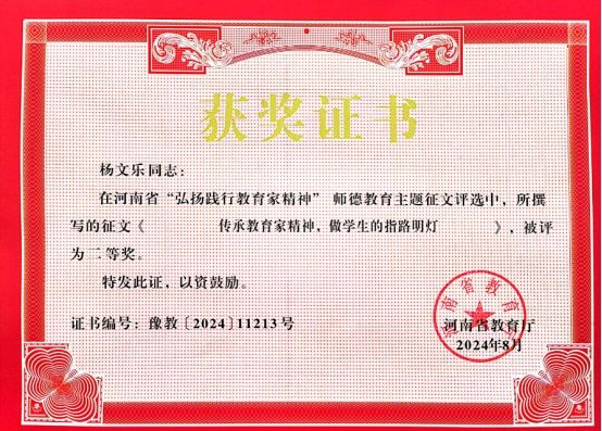 近日,河南省教育厅公布了“弘扬践行教育家精神”师德主题教育征文获奖名单,永利官网杨文乐老师的征文《传承教育家精神,做学生的指路明灯》在此次征文评选中荣获二等奖。