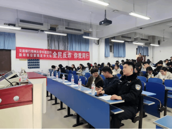 新郑市公安局反诈大队队长刘朋举、交通银行铁道支行副行长底芝晓、交通银行大学中路支行客户经理严秀敏、304永利集团官网入口研究生管理办公室主任李超、物流工程专业师生代表出席本次反诈宣讲活动。