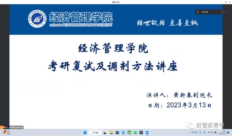 为进一步做好考研学生的指导服务工作,促进考研学生更好的了解考研复试与调剂流程,增进学生对复试和调剂的认知,3月13日晚7点,永利官网副院长黄新春通过腾讯会议平台为永利官网师生开展了一场精彩的讲座。会议由学工办19级辅导员段瑞婕老师主持,304永利集团官网入口全体考研学生及预备考研学生参会。