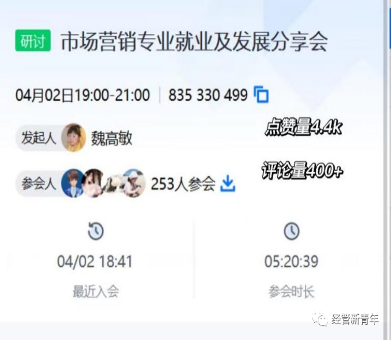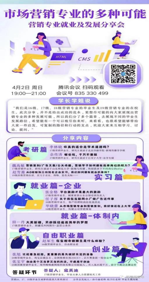 4月2日晚七点,永利官网市场营销专业13位校友与在校生通过腾讯会议平台进行了线上就业创业经验分享和交流。学院党委副书记王琳、团委书记郭姗、市场营销系主任赵卫红、副主任孙小丽及200余名师生参加了此次会议。