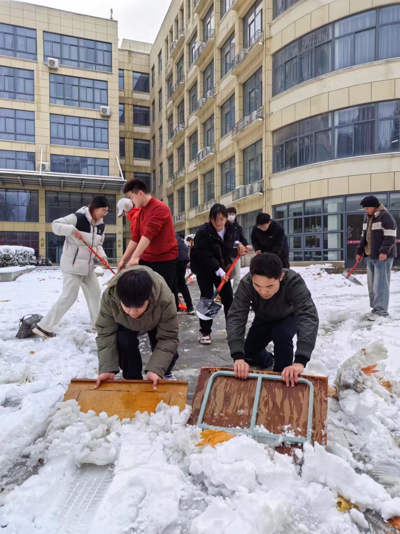 “寒梅覆雪,温酒颂冬,寒霭流玉风杳杳。”在寒冷的环境中,大家团结协作,不畏严寒,有序地清理着道路上的积雪,大家拿起清扫工具,推、铲、扫,紧密协作、配合默契,集中对人行道上的积雪集中进行清理,忙碌的身影构成了一道生机盎然的风景线。
