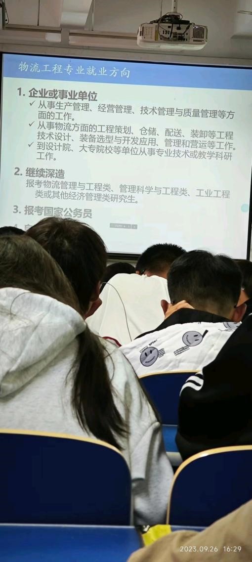 9月26日,物流工程专业召开2023级新生专业教育大会。老师介绍了物流工程专业师资队伍、人才培养目标、课程设置、实践教学、第二课堂等专业情况;对永利官网本科生学分制和学籍管理规定进行了详细的说明,勉励同学们做好学业规划及自我管理,尽快适应大学生活,培养自主学习习惯,树立专业自信;从未来出发,分析物流专业的行业发展、学生就业考研,希望同学们明确学习奋斗目标,有效开展专业学习。