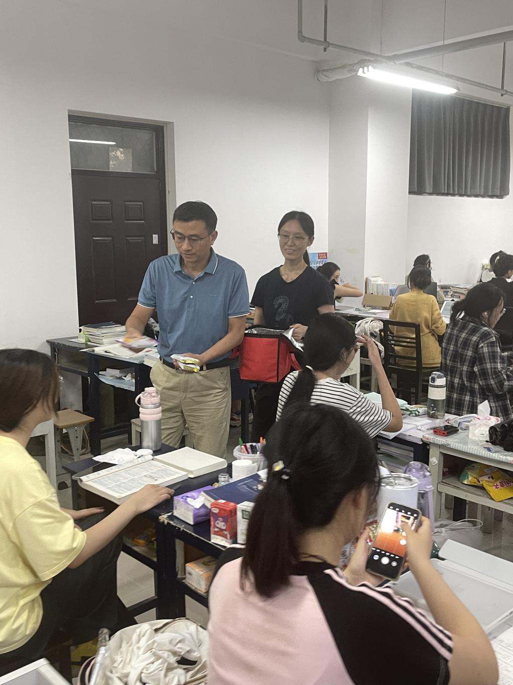 在学院考研自习室,李向东对克服各种困难、沉下心来坚持学习的同学们表示赞扬 ,叮嘱大家要合理安排作息、做到劳逸结合,要提高安全意识、保持信息畅通,遇到问题及时与学院沟通反馈,鼓励大家要继续保持学习热情、坚持不懈,预祝大家都能考研成功。之后,学院为同学们送上了雪糕,在炎炎夏日送上了学院的关怀与问候。