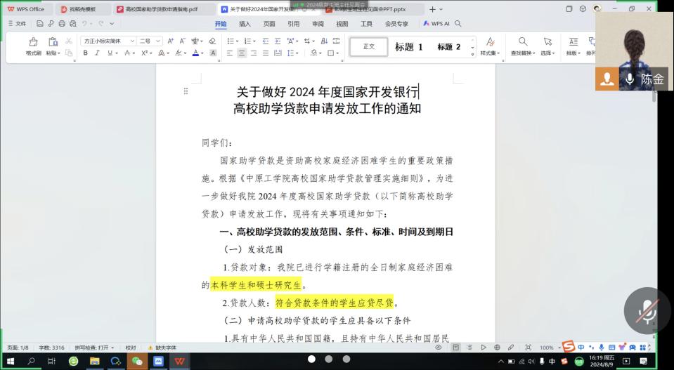 学工办副主任陈金对高校助学贷款政策进行了宣传和讲解,鼓励家庭经济困难学生积极申请助学贷款,能安心学习,无后顾之忧。接下来,班主任也将召开新生见面会,进行专业简介、资助和医保政策宣传。