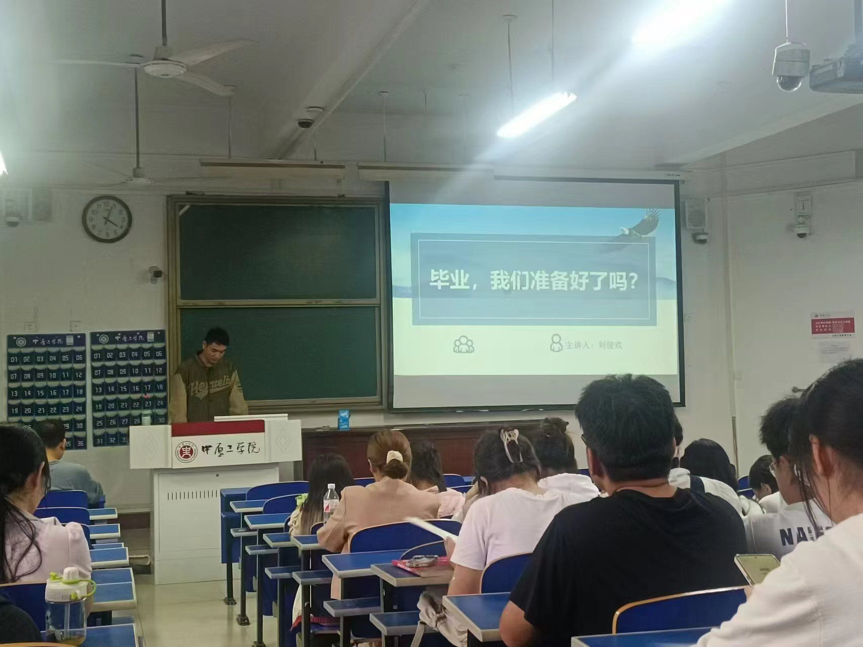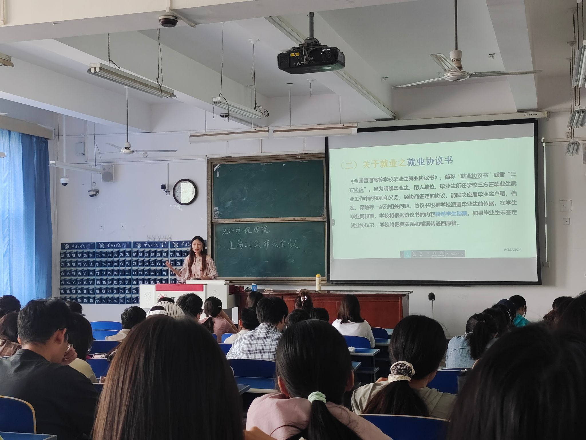 会上,各位毕业班辅导员详细讲解了毕业生需满足的各项条件,包括学分要求及实习要求等,并提醒学生们注意提交毕业材料。在就业求职环节,为毕业生们分析了当前就业市场的趋势,揭示了就业过程中可能遇到的陷阱,如虚假招聘信息、不合理合同条款等,提醒学生们提高警惕,保护自身权益。针对有意向继续深造的学生,详细介绍了考研考公形势、报名流程等信息,在心态调整方面着重分析引导。此外,还为毕业生们介绍了入伍的基本条件、报名流程、选拔标准以及国家对入伍大学生的优待政策。