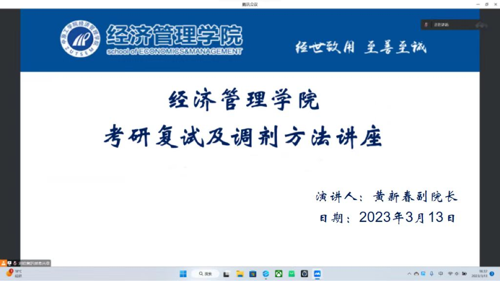为进一步做好考研学生的指导服务工作,促进考研学生更好的了解考研复试与调剂流程,增进学生对复试和调剂的认知,3月13日晚7点,永利官网副院长黄新春通过腾讯会议平台为永利官网师生开展了一场精彩的讲座。会议由学工办19级辅导员段瑞婕老师主持,304永利集团官网入口全体考研学生及预备考研学生参会。